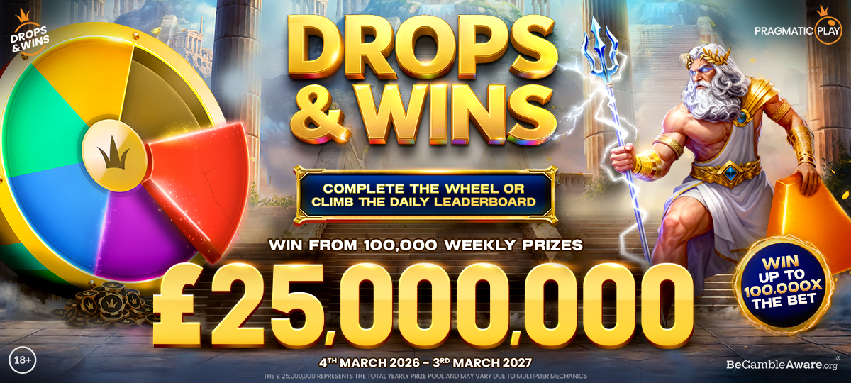 Promotion runs from 4th March 2026 18:01 until 3rd March 2027 at 17:59 UK time. Only play on participating titles will count. Weekly Wheel Drops: Any real-money stake qualifies. Collect three wheel pieces to spin the wheel and win a random prize. Prizes up to 100,000X the bet. Max two prizes per player per Weekly Wheel Drop. Daily Tournaments: Prizes based on leaderboard rank. Min. bet to qualify: £0.05. Prizes awarded as cash. Prizes up to £3,000. Cash prizes have no wagering requirements. T&Cs apply. 18+. Full T&C’s apply.
