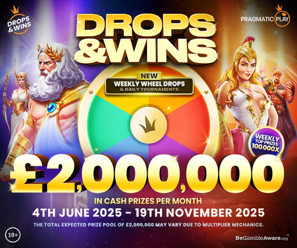 From 4th June to 19th November 2025, Pragmatic’s £2,000,000 Drops & Wins returns – now with brand new Wheel Drops and the return of Daily Tournaments!