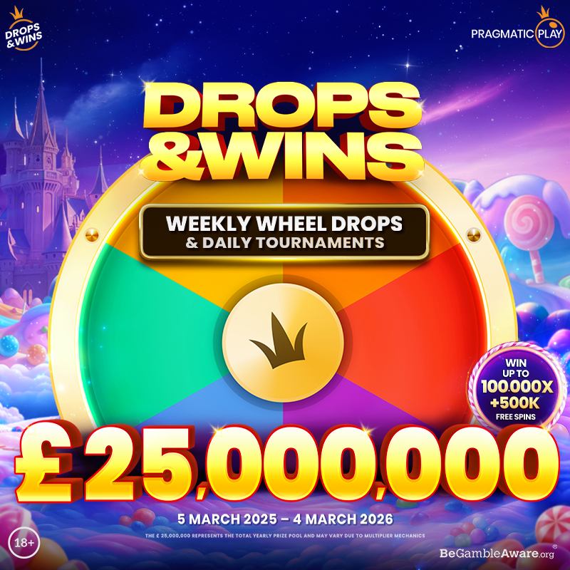 Between 19th November 2025 and 4th March, Pragmatic’s £25,000,000 Drops & Wins returns with more than 50,000 weekly prizes available!